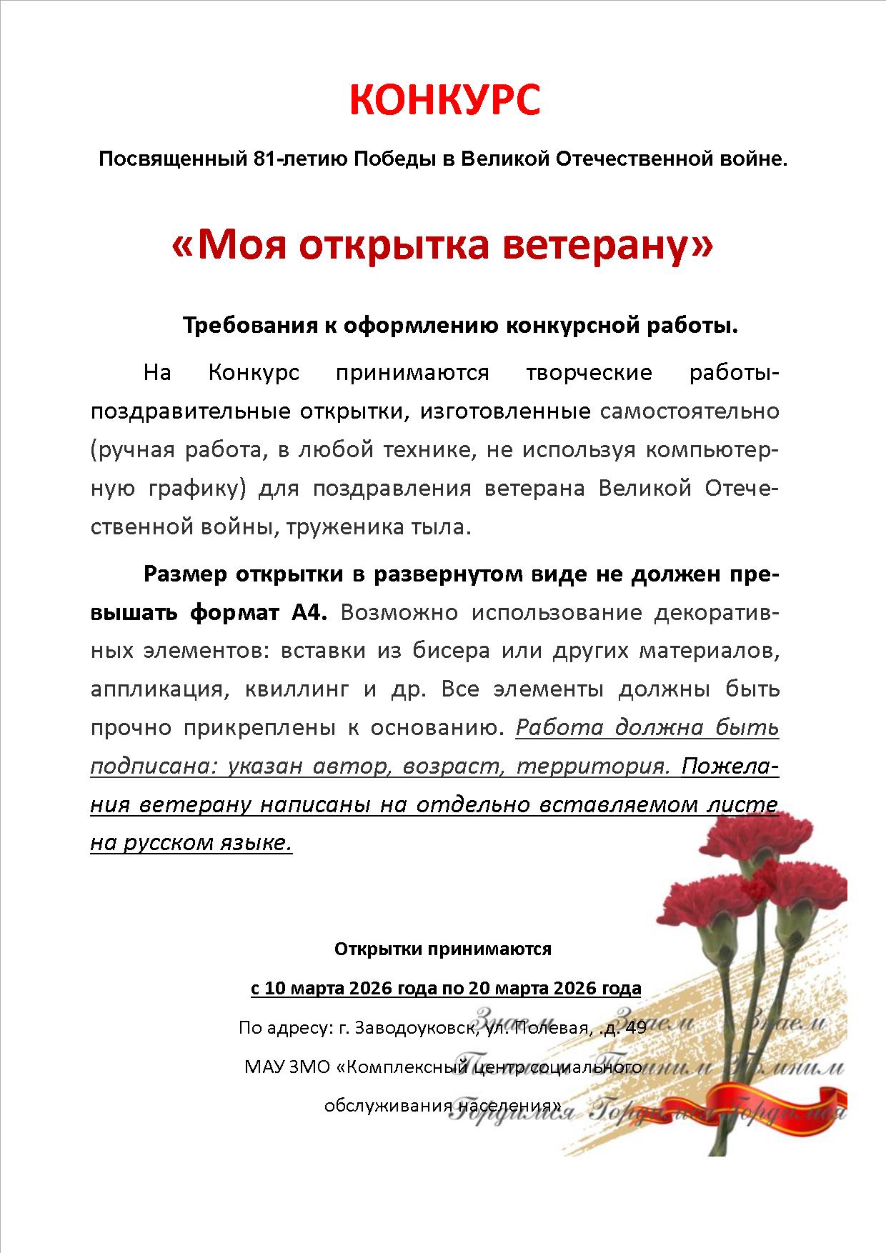 КОНКУРС «Моя открытка ветерану», посвященный 81-летию Победы в Великой Отечественной Войне.